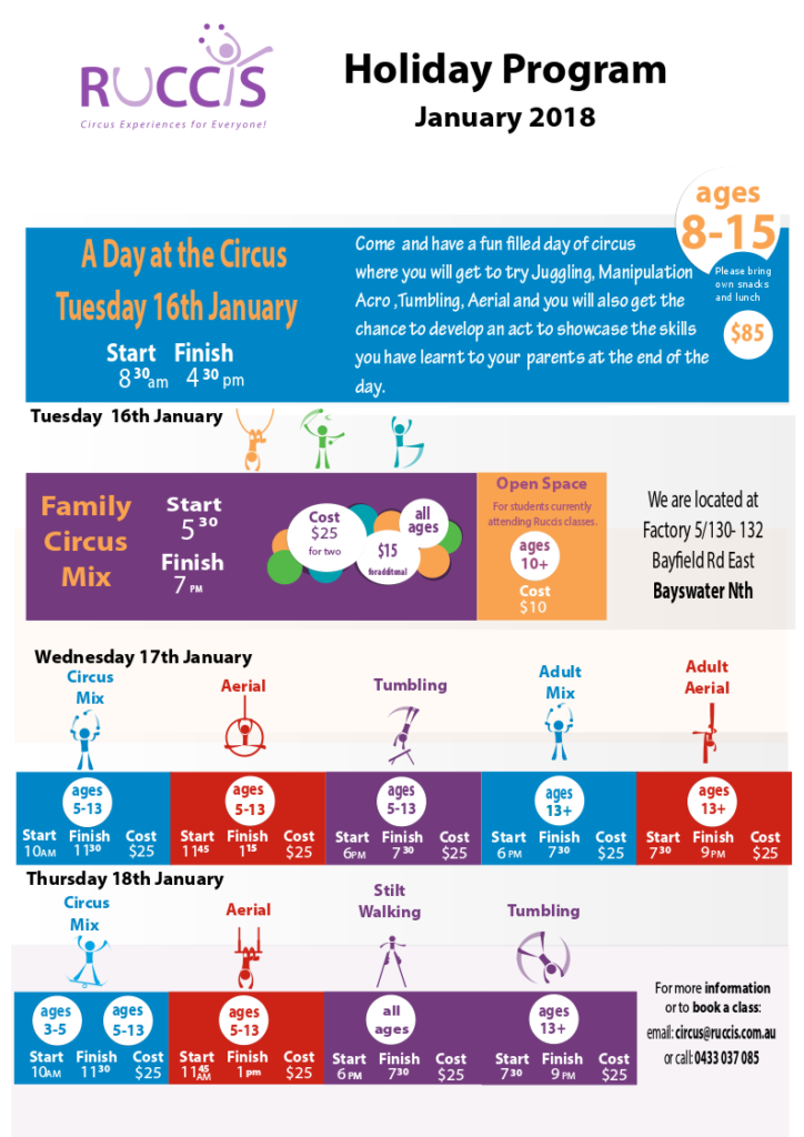 Circus Mix classes cover a wide range of circus skills, including acro balance, juggling, tightrope, trapeze, hula hoops, handstands, silks, poi, mini trampoline, lyra, walking globe, unicycle, aerial rope, plate spinning, tumbling and more!